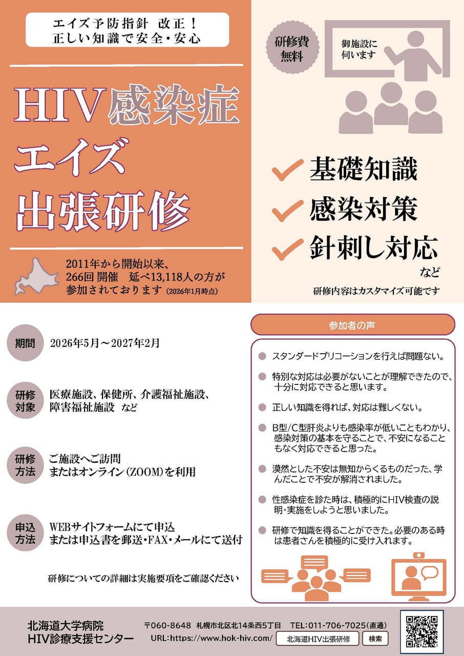 北海道大学病院では、北海道ブロックエイズ治療拠点病院として、HIV感染症の医療水準の向上や均てん化を目的にご希望の施設に出向いて研修会を行う「HIV/AIDS出張研修」を実施しております。研修方法は「ご施設へ訪問」と「オンライン(zoom)」のどちらかをご選択いただけます。実施要項をご確認の上、是非お申込下さい。